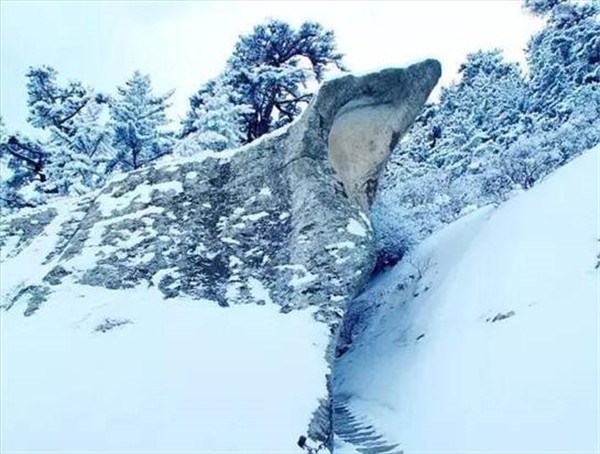 看過(guò)金庸武俠小說(shuō)的童鞋們,一定聽過(guò)全真教。那么全真崖呢?它位于南天門西,為松檜峰頂向南懸空傾伸之崖石。出南天門越長(zhǎng)空棧道可至崖下。崖腹部有賀老石室,是元初道士賀志真開辟的修行之地?!赌戏逵洝分杏浭觯?ldquo;巖類俯首形,遙覆室上,上書“全真巖”三字,赤色以實(shí)之。雖知人所為,然上不可下,下不可上,其履虛而作之邪?何其神也!”