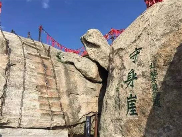 位于華山西峰頂摘星石北。民間傳說(shuō)古時(shí)有個(gè)孝子,雙親身染重疾,久治不愈,聽說(shuō)岳神靈驗(yàn),便登山拜神求醫(yī)。在向岳神祈禱的過(guò)程中,孝子許愿說(shuō)只要雙親病愈,愿舍去自己的性命來(lái)報(bào)答神靈。果然,當(dāng)孝子返回家中時(shí),父母都已康復(fù),且已下田耕作去了。孝子還愿來(lái)到華山,毫不猶豫的從此處跳下深淵,可他卻覺得身體若有人托起,似乘長(zhǎng)風(fēng),飄飄欲仙。待清醒時(shí),原來(lái)依然躺在家中,似夢(mèng)非夢(mèng)。孝子知道是華山神暗中相助,便告別父母到華山西峰作了道士。后人被孝子的誠(chéng)心感動(dòng),就將此處命名為舍身崖。 清道光年間李榕的伯祖李仁龍為阻止后人仿效孝子的行為,改舍身崖為省身崖,以警示忤逆之街徒游到這里時(shí)應(yīng)對(duì)照孝子,自警自省,痛改前非。后來(lái)又有人認(rèn)為舍身救雙親的行為并不可取,也稱崖作守身崖,以教育后人生命可貴,不可輕擲。