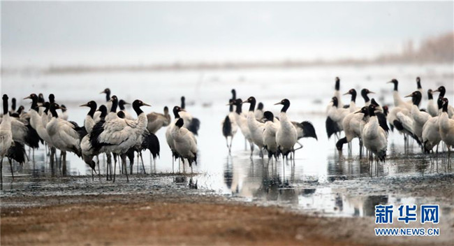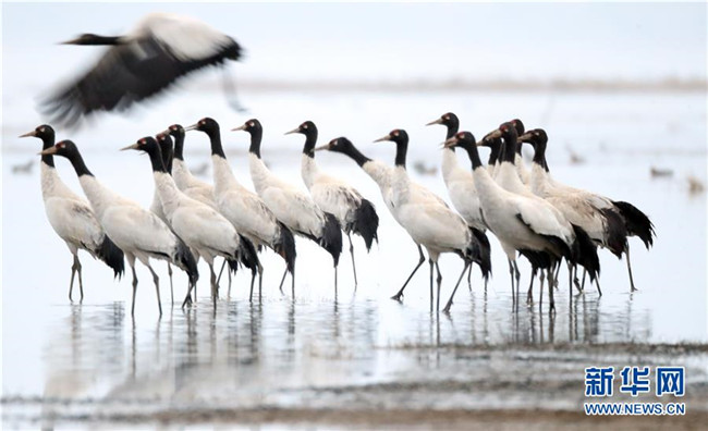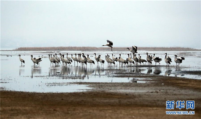 2月21日在草海國家級自然保護(hù)區(qū)內(nèi)拍攝的黑頸鶴。新華社發(fā)(韓賢普攝)