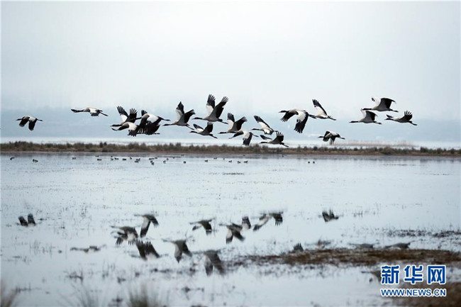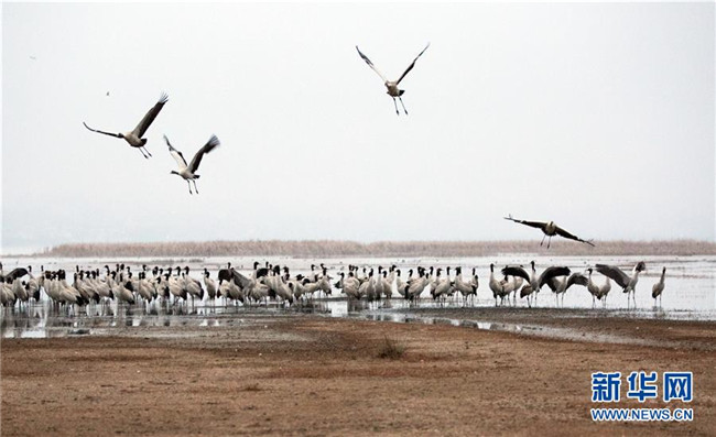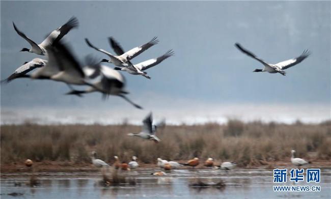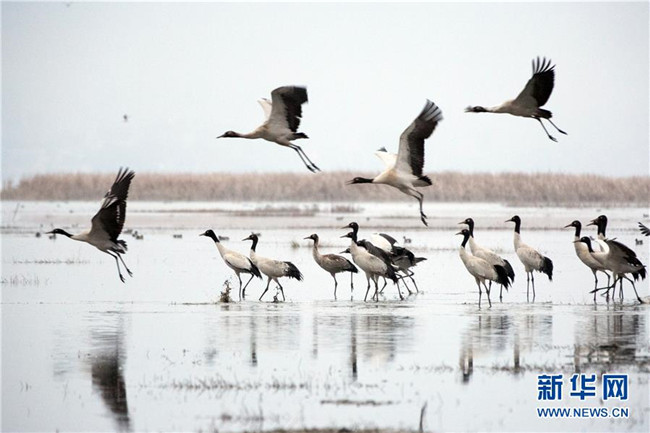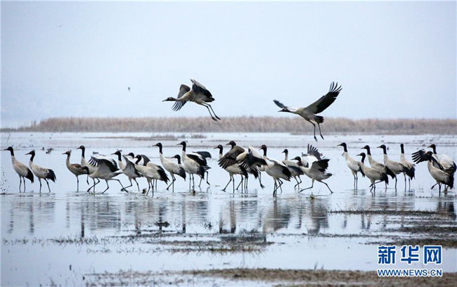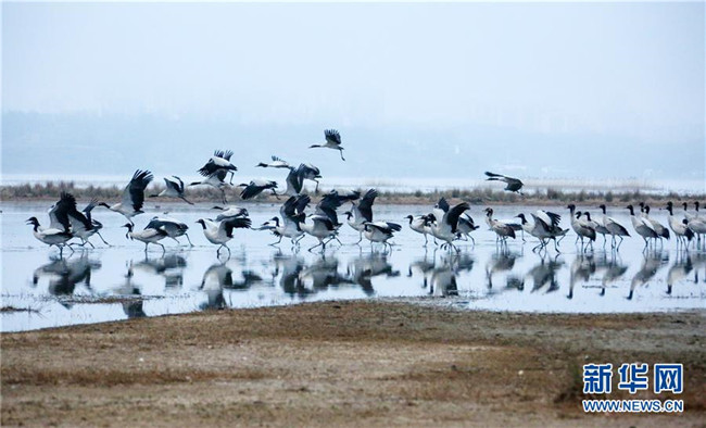 草海保護(hù)區(qū)是黑頸鶴越冬的主要棲息地之一,其在草海越冬期約為每年10月下旬到次年3月底。黑頸鶴是全球唯一在高原生長、繁殖的鶴類。新華社記者楊楹攝