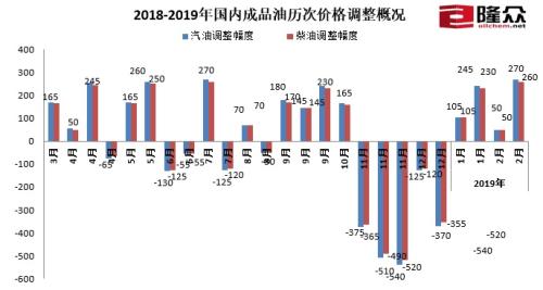 2018-2019年國內成品油歷次價格調整概況。來源:隆眾資訊