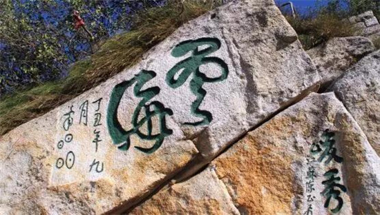 在蒼龍嶺上方平臺邊崖上刻有“云海”二字,落款就是“OO”題,不知“OO”是什么字?有人說是“昌”“明”二字,有人說是陜西關中方言“jiao”(意思就是太陽光很火辣),到底是什么字,至今既無稽可考,也無典可查,成為一大字謎。