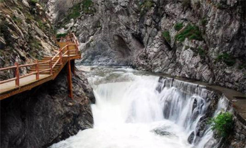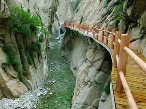 第二游:仙峪(仙峪,又名車箱谷,在華山峪西,與華山峪僅一嶺之隔,傳說古時黃初平、黃初起弟兄在此牧羊成仙,因而得名。仙峪深五十余里,峪道窄狹清幽,山路崎嶇蜿蜒,河流湍急,山石險峻,多處路段鑿崖,加棧凌空通過。進(jìn)峪五里處,有斜嶺橫阻,令人有谷盡路絕之感,然越嶺橫度,又平添柳暗花明的情趣)。