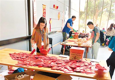 春節(jié)那天,學(xué)校為中國(guó)留學(xué)生安排了新春活動(dòng),準(zhǔn)備了很多裝有金幣巧克力的紅包,派送的小餅干里還夾著新年祝福;不經(jīng)意間,我驚喜地發(fā)現(xiàn),墻面上還藏了許多謎語(yǔ)。對(duì)于過(guò)年還要上課的我們來(lái)說(shuō),這已是最大的“年味”了。