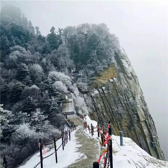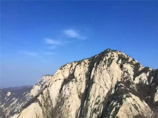 量掌山雖矮于華山主峰,但山峰險峻,危崖聳立,崖體裸露呈赭色,巖石皴理異常美麗,其造化之妙如出畫家之手。尤其是在陽光照耀下,更加燦爛輝煌,雄奇壯觀。攀登量掌山的道路非常險峻,古時除一些羽林高手外,很少有人登峰。