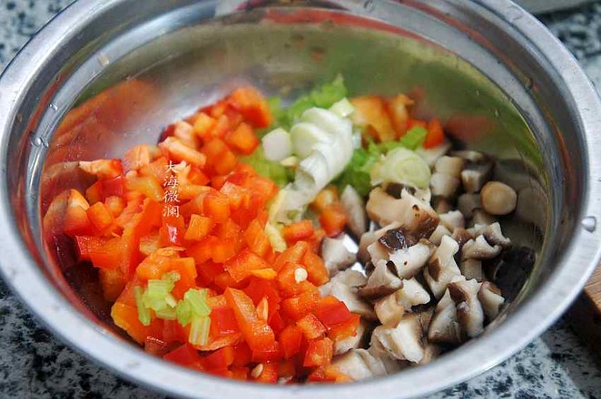 2.青椒、紅椒洗凈切小丁,香菇洗凈焯水后再洗凈切丁,蔥姜去皮洗凈切碎