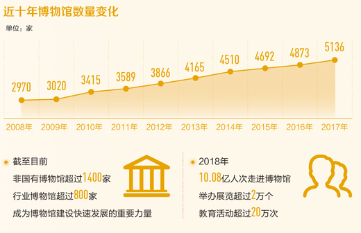 據(jù)文化和旅游部統(tǒng)計(jì),2008年至今,我國(guó)博物館的數(shù)量呈現(xiàn)明顯加速增長(zhǎng)之勢(shì)。截至2017年底,全國(guó)在各級(jí)政府備案的博物館達(dá)到了5136家,每年新增博物館平均在180家左右。