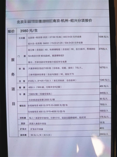 學(xué)生家長提供的北京某中學(xué)初一年級南方研學(xué)游報價明細(xì)。記者 黃哲程 攝