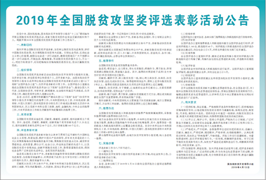 經(jīng)黨中央、國務院批準,國務院扶貧開發(fā)領導小組在“十三五”期間每年開展全國脫貧攻堅獎評選活動,表彰為脫貧攻堅作出突出貢獻的組織和個人?,F(xiàn)就開展2019年全國脫貧攻堅獎評選表彰工作公告如下。
