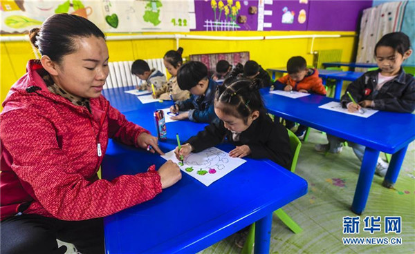 4月21日,在河北省饒陽縣小哈佛幼兒園開展的“愛護(hù)地球 從我做起”主題活動(dòng)中,老師指導(dǎo)學(xué)生手繪愛護(hù)地球環(huán)境繪畫作品。