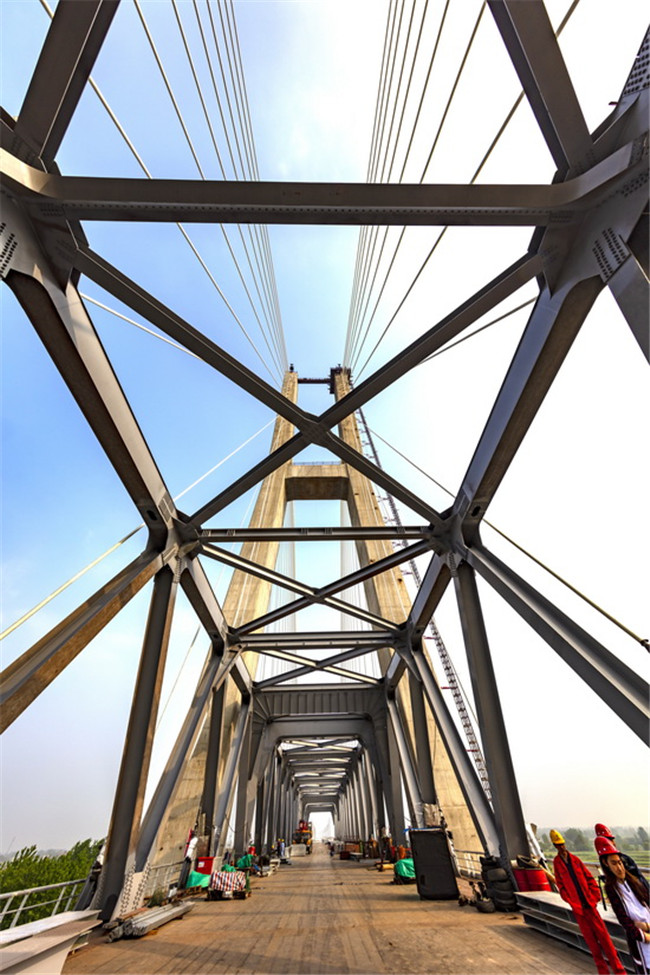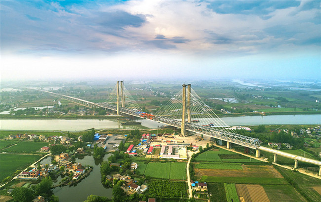 商合杭鐵路重點(diǎn)控制性工程裕溪河特大橋,主橋全長(zhǎng)686米,主塔采用“H”型索塔,塔高123米。在我國(guó)時(shí)速350公里高速鐵路大跨度斜拉橋建設(shè)中,首次使用鋼箱桁梁結(jié)構(gòu)形式,首次在300米以上跨度橋梁中采用無(wú)砟軌道結(jié)構(gòu)形式,大橋主跨跨度達(dá)324米,建成后將成為目前世界最大跨度的無(wú)砟軌道高速鐵路橋梁。