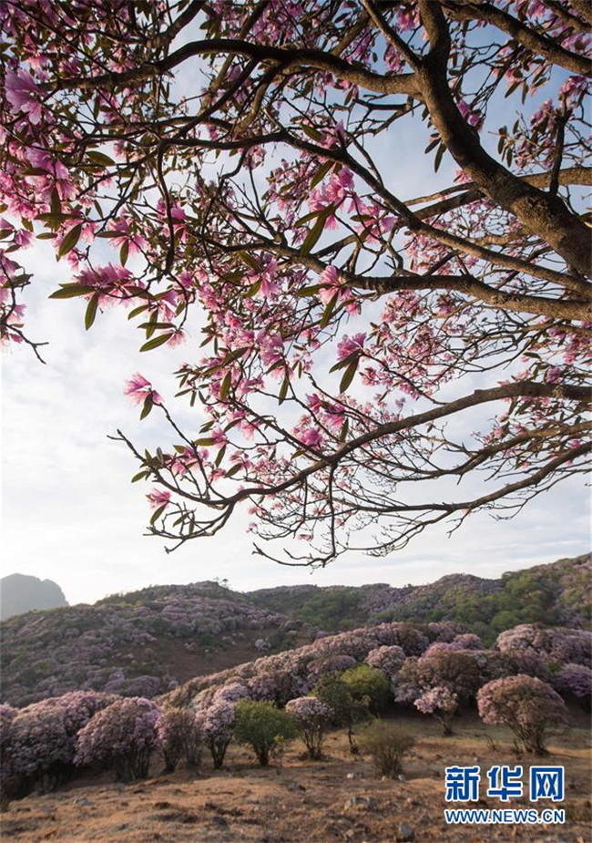 4月23日,戶外愛(ài)好者經(jīng)過(guò)龍頭山野生杜鵑花。 近日,四川省攀枝花市鹽邊縣龍頭山十余萬(wàn)畝野生杜鵑花盛開(kāi),吸引省內(nèi)外游客前來(lái)登山賞花。 龍頭山位于四川省攀枝花市鹽邊縣北部的紅寶苗族彝族鄉(xiāng)境內(nèi),這里的野生杜鵑花花期為2月至5月。 新華社記者 江宏景 攝
