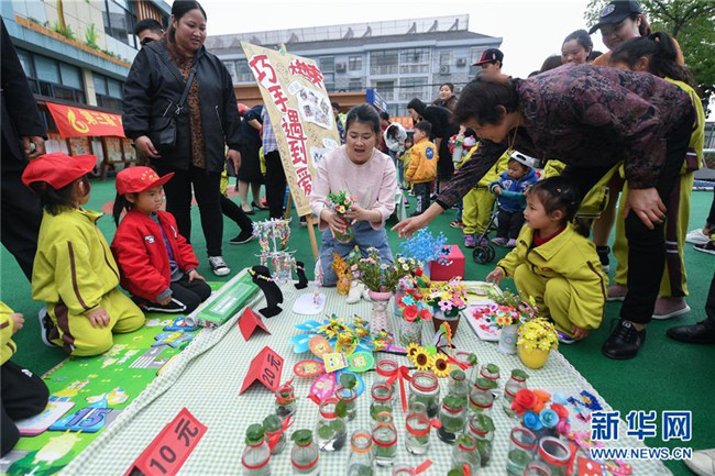 當(dāng)日,浙江省長(zhǎng)興縣畫溪街道包橋中心幼兒園舉辦校園義賣節(jié)。10多個(gè)攤位上擺放著家長(zhǎng)和孩子一起用廢舊的玻璃瓶、雪糕棍、紙盒、紐扣等廢舊材料制作而成的小木屋、迷你小盆栽、紐扣花束、風(fēng)車等手工作品,孩子們以班級(jí)為單位進(jìn)行手工作品義賣,所得款項(xiàng)將全部用于社區(qū)公益環(huán)?;顒?dòng)。主辦方介紹,希望通過這樣的活動(dòng),倡導(dǎo)廢物利用和綠色低碳的生活理念。