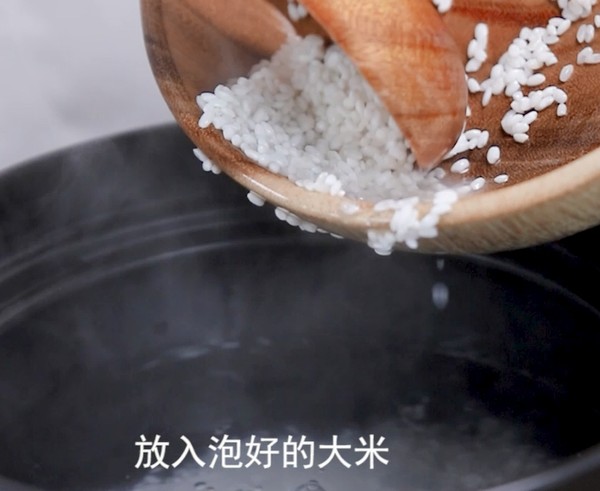 \n放入泡好的大米再放入腌制好的肉沫和香油攪拌開,大火燒開,轉小火熬煮30分鐘
