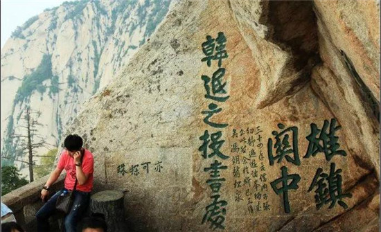 一座山就是一塊花崗巖巨石,自古華山一條道,唐時韓愈游華山,雄心勃勃,攀至蒼龍嶺時,向下望了一眼,頓時覺得頭暈?zāi)垦?,兩腿打?zhàn),兩腋生風(fēng),再也不敢挪動一步,趺坐于山脊一凹處,上不去,下不來,走投無路。絕望之下,將衣衫撕成片,寫下求救信,扔下山崖,終有一條被人揀到,報與官府,這才得救。現(xiàn)有蒼龍嶺“韓愈投書處”為證。