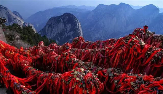 蓮花峰因為一個傳說故事而得名,即《寶蓮燈》沉香劈山救母。便是指這華山西峰了。石徑兩邊的保護(hù)鏈上掛滿了祈福的金鎖。這也成為了華山一景。