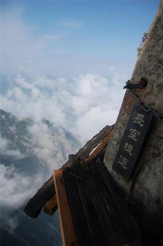 華山的石徑與別的山不同,別的山的路是砌出來的,而華山因為整座山是整塊石,又是質(zhì)地堅硬的花崗巖,路都是在山體上鑿刻出來的。
