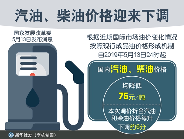 國內汽油、柴油價格將迎來下調。國家發(fā)展改革委13日發(fā)布消息,根據(jù)近期國際市場油價變化情況,按照現(xiàn)行成品油價格形成機制,自2019年5月13日24時起,國內汽油、柴油價格每噸均降低75元。