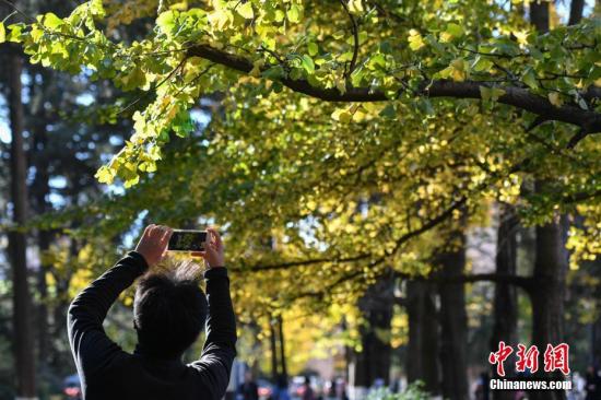 大學(xué)校園內(nèi)銀杏樹葉變黃,吸引民眾前來拍照游覽。中新社記者 任東 攝