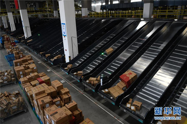 在浙江嘉興菜鳥“未來園區(qū)”,商品按照包裹地址的不同進行自動分撥(3月27日攝)。新華社記者 黃宗治 攝