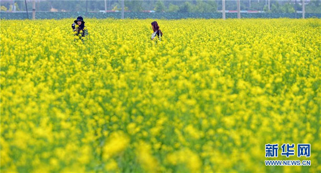 近日,在遼寧省沈陽市沈北新區(qū)時(shí)空東街與蒲民北路交叉口附近,成片的油菜花競相綻放,吸引眾多游客前來觀賞。 新華社記者 楊青 攝