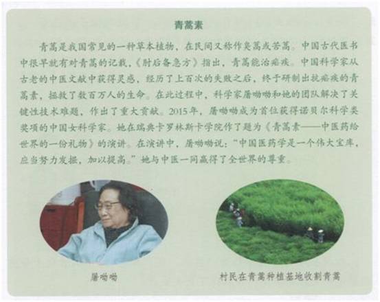 據(jù)悉,今年秋季學(xué)期將開始推廣的統(tǒng)編高中語文教材已確定將屠呦呦2011年的獲獎感言及同年發(fā)表的論文改編成課文《青蒿素:人類征服疾病的一小步》。人民教育出版社有關(guān)負責(zé)人介紹,屠呦呦在青年時期培養(yǎng)了對傳統(tǒng)醫(yī)藥學(xué)的熱愛,歷經(jīng)數(shù)年終于從古代藥典中獲得靈感,發(fā)現(xiàn)了青蒿素,并且至今仍在科學(xué)探索道路上孜孜以求。此次選錄這篇文章,旨在引導(dǎo)學(xué)生了解和尊重科學(xué),從屠呦呦的科研歷程中汲取力量。