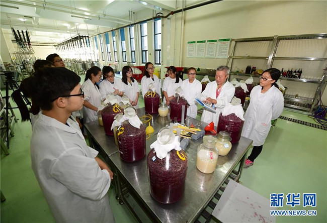 西北農(nóng)林科技大學(xué)葡萄與葡萄酒工程專業(yè)學(xué)生在葡萄酒釀造課上聽取李華教授(右二)講解注意事項(xiàng)(2017年9月7日攝)。新華社記者邵瑞攝