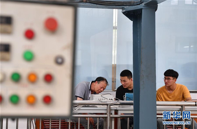 在西北工業(yè)大學(xué)航海學(xué)院消聲水池實(shí)驗(yàn)室,教師張爭(zhēng)氣(左一)正在指導(dǎo)學(xué)生進(jìn)行測(cè)量實(shí)驗(yàn)(6月17日攝)。新華社記者張博文攝