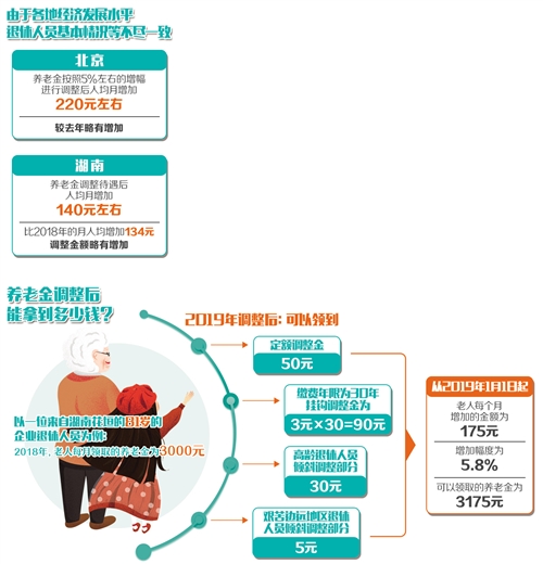 比如,北京市人力資源和社會保障局發(fā)布的調(diào)整方案顯示,養(yǎng)老金按照5%左右的增幅進(jìn)行調(diào)整后,人均增加220元左右,較去年略有增加;湖南省公布的退休人員養(yǎng)老金調(diào)整方案顯示,養(yǎng)老金調(diào)整后,人均月增加金額為140元左右,比2018年的月人均增加134元,調(diào)整金額略有增加;寧夏決定從2019年1月1日起調(diào)整全區(qū)企業(yè)和機(jī)關(guān)事業(yè)單位退休人員基本養(yǎng)老金,其中企業(yè)提高比例為5.5%,機(jī)關(guān)事業(yè)單位提高比例為4%,預(yù)計(jì)全區(qū)共有63.67萬人受益。