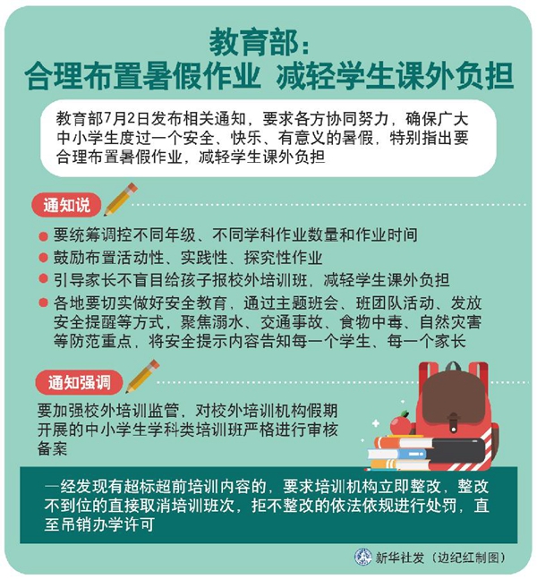 暑假將至,教育部2日發(fā)布相關(guān)通知,要求各方協(xié)同努力,確保廣大中小學(xué)生度過(guò)一個(gè)安全、快樂(lè)、有意義的暑假,特別指出要合理布置暑假作業(yè),減輕學(xué)生課外負(fù)擔(dān)。