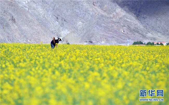 7月2日,拉薩市堆龍德慶區(qū)德慶鄉(xiāng)的村民在打理油菜花田。近日,西藏各地的油菜花盛開,呈現(xiàn)出生機(jī)勃勃的夏日美景。新華社記者李鑫攝