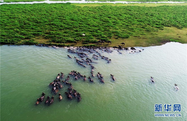 7月2日傍晚,在四川省南充市蓬安縣油房溝村,百余頭水牛橫渡嘉陵江歸欄(無人機拍攝)。新華社發(fā)(劉永紅攝)