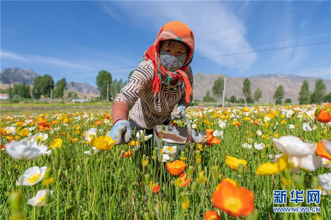 7月6日,甘肅省高臺縣新壩鎮(zhèn)紅沙河村村民在花田中勞作。 新華社發(fā)(鐘曉亮 攝)