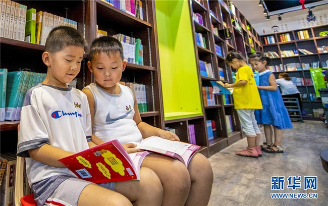7月9日,孩子們在河北省衡水市武邑縣新華書店閱讀圖書。新華社記者 李曉果 攝