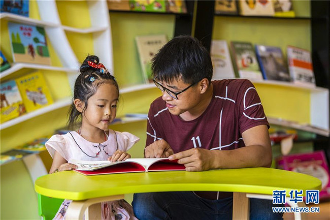 7月9日,在河北省衡水市武邑縣新華書店,小朋友在家長陪伴下讀書。新華社記者 李曉果 攝
