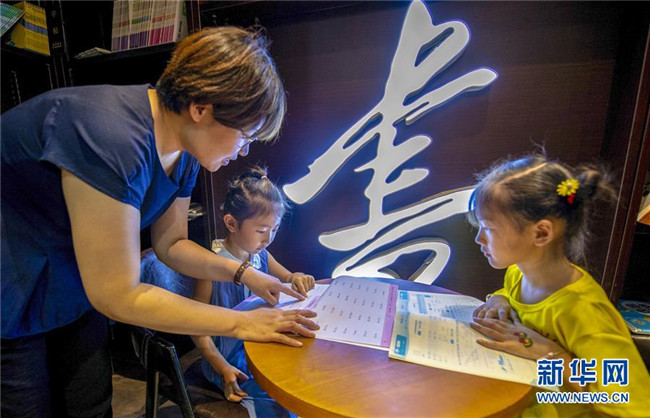 7月9日,在河北省衡水市武邑縣新華書店,小朋友在家長陪伴下讀書。 新華社記者 李曉果 攝