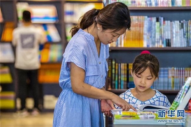 7月9日,河北省衡水市武邑縣新華書店,小朋友在家長的陪伴下挑選圖書。新華社記者 李曉果 攝