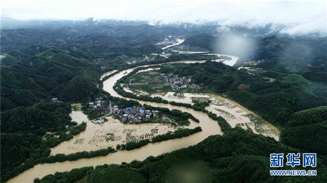 7月9日,廣西柳州市融安縣大將鎮(zhèn)部分地區(qū)被洪水淹沒(無人機拍攝)。新華社發(fā)(譚凱興 攝)