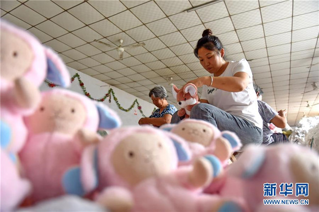 7月9日,河北臨城縣辛安莊村村民在當(dāng)?shù)匾?ldquo;扶貧車間”內(nèi)加工毛絨玩具。新華社記者 朱旭東 攝