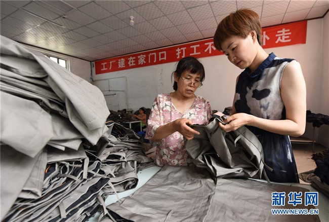 7月9日,河北臨城縣西鴨鴿營村村民在當(dāng)?shù)匾?ldquo;扶貧車間”檢查服裝成品質(zhì)量。新華社記者 朱旭東 攝