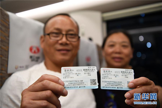7月11日,乘坐G319次列車的乘客展示前往香港的車票。當(dāng)日,重慶至香港直達(dá)高鐵正式開通,此次首發(fā)的G319次復(fù)興號列車運(yùn)行速度350km/h,沿途經(jīng)停遵義、貴陽東、桂林西、肇慶東、廣州南和深圳北站。列車由重慶西站至香港西九龍站全程運(yùn)行需7小時(shí)37分鐘,全程票二等座票價(jià)為660元。目前內(nèi)地與香港聯(lián)通的高鐵車站已增加到58個(gè)。新華社記者唐奕攝