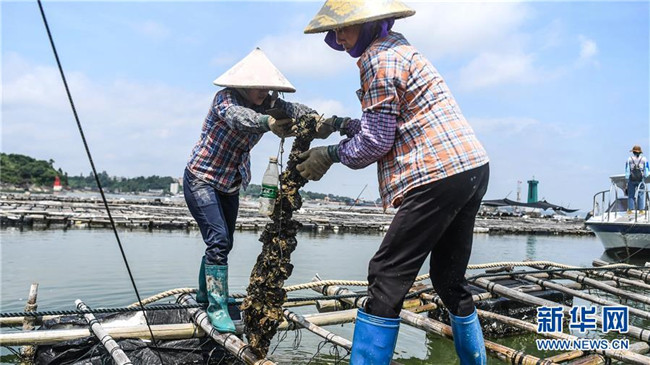 村民在蠔排上提取蠔柱收獲大蠔(7月20日攝)。 新華社記者 張愛(ài)林 攝
