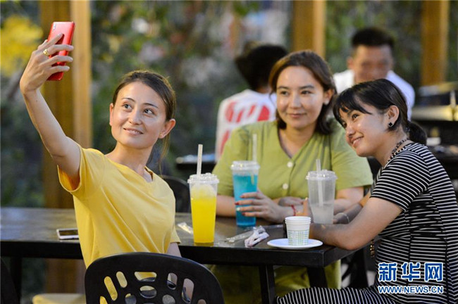 7月19日,市民在吐魯番市長沙·葡萄主題公園夜市拍照留念。