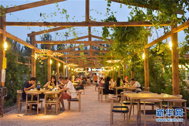 在吐魯番市長沙·葡萄主題公園夜市,市民和游客在葡萄架下用餐(7月18日攝)。