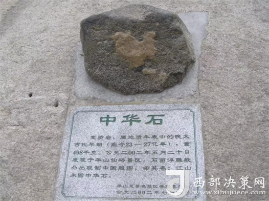 “中華石”于2002年5月20日在華山仙峪景區(qū)被發(fā)現(xiàn)。在淡墨色花崗巖石面上,浮雕般凸現(xiàn)出一塊白色石圖,此圖酷似現(xiàn)制中國(guó)版圖,十分形象通真。該石重約498千克,云母花崗巖石,大約形成于三千萬(wàn)年前的白堊時(shí)期,現(xiàn)置北峰。(供稿:華旅集團(tuán)營(yíng)銷中心)