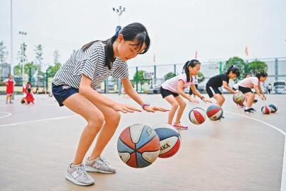 8月5日,南充小學(xué)生在操場(chǎng)上練習(xí)運(yùn)球?! ”緢?bào)記者 楊樹 攝