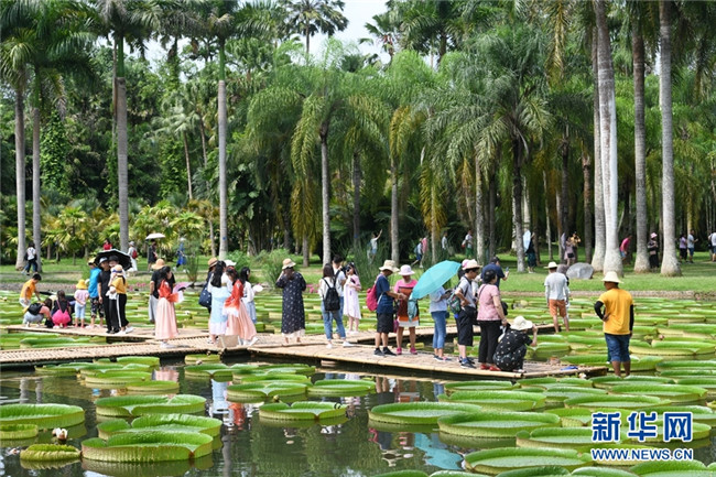 王蓮原產(chǎn)于南美洲熱帶地區(qū),西雙版納熱帶植物園自1963年開始引種,經(jīng)過多年的培育,已成為植物園一張亮麗的名片。每年6月—10月是王蓮的最佳觀賞時間,不少游客都會慕名前來,觀賞這種神奇的植物。新華網(wǎng)發(fā)(張嬌嬌 攝)