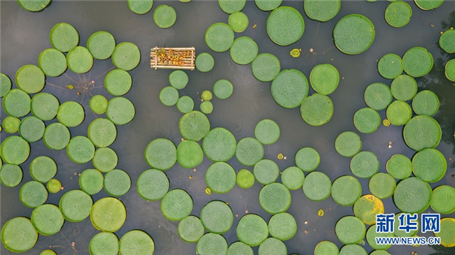 巨大的王蓮葉片如同一個個綠色的大玉盤,錯落有致地鋪滿整個水塘。新華網(wǎng)發(fā)(張嬌嬌 攝)