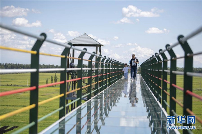 8月18日,游客在新疆察布查爾錫伯自治縣納達(dá)齊牛錄鄉(xiāng)稻田畫(huà)基地的玻璃棧道上賞景。