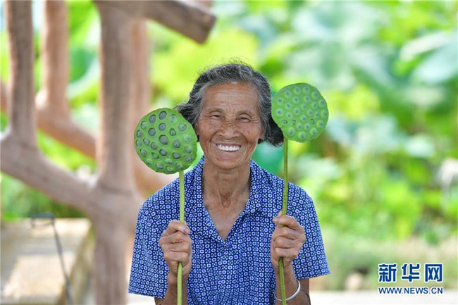 在廣西鹿寨縣中渡鎮(zhèn)大兆村,80歲的黃世秀老人在展示準(zhǔn)備出售的蓮蓬(8月23日攝)。新華社記者 黃孝邦 攝
